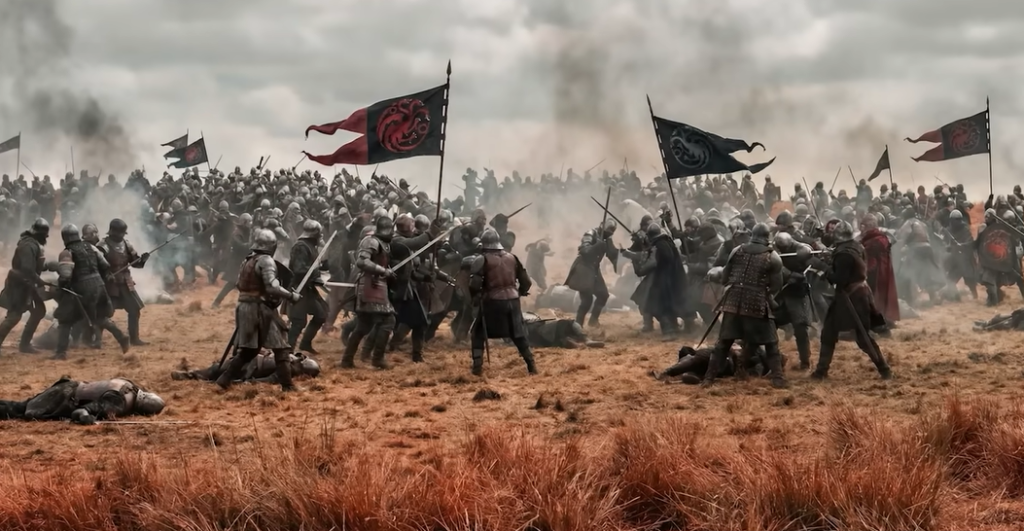 Dunk और उसके साथी योद्धा घबराते हैं, लेकिन Prince Baelor नेतृत्व करता है। यह scene tension से भरा है, जहां हर knight का अपना motive है जैसे honor, revenge या game का मजा।